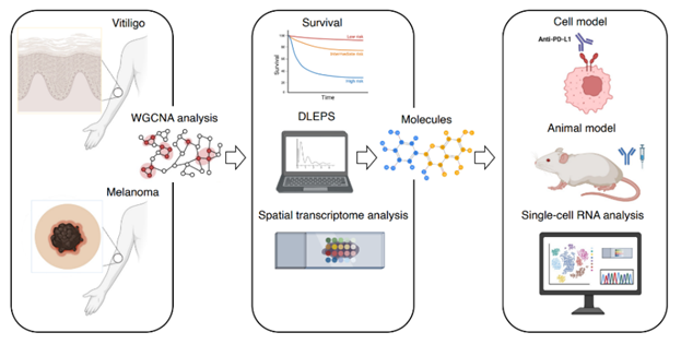 近年来,免疫治疗已成为肿瘤治疗领域的重要突破,但目前只有少部分患者能够从该疗法中得到持久的生存获益。前期研究发现,在黑色素瘤中,白癜风样色素脱失是一种常见且通常较轻的免疫相关不良事件,其发生发展与增强的抗肿瘤免疫反应和延长患者生存期呈正相关。该研究通过对比分析白癜风与黑色素瘤的分子特征,构建了一套精准的生物标志物VGS,该标志物可高效区分“冷肿瘤”与“热肿瘤”,为患者免疫治疗分层提供了科学依据。此外,该研究进一步筛选并验证了Fulvestrant(氟维司群)是一种能够在临床前模型中增强PD-L1抗体疗法的候选药物。