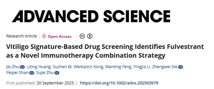 近日,我校朱素杰教授、单佩佩副教授研究团队联合北京大学谢正伟教授团队,在《Advanced Science》杂志在线发表题为“Vitiligo Signature-Based Drug Screening Identifies Fulvestrant as a Novel Immunotherapy Combination Strategy”的研究论文。朱杰、黄丽婷、毕素贞、孔维恺忻为本文的第一作者,朱素杰教授、单佩佩副教授、谢正伟教授、朱杰博士为本文通讯作者。青岛大学附属医院为第一单位和通讯单位。本研究得到了国家自然科学基金、山东省青创团队等项目的资助。